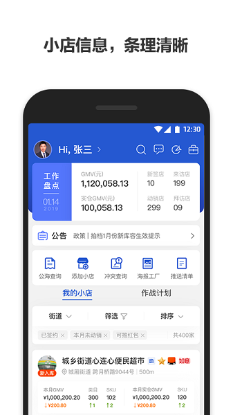 2、提供全面的店铺管理功能模块,仅需一部智能手机即可完成从采购到销售的全业务流程管理;
