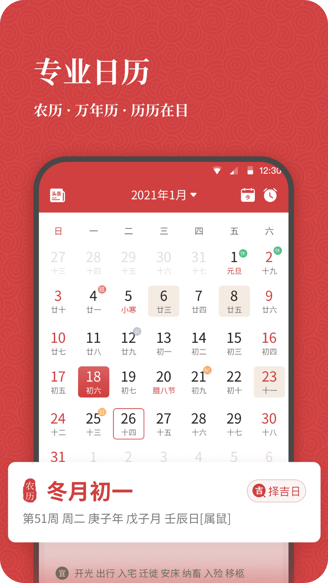 开薪老黄历App是一款专业实用的黄历查询工具,完全免费为用户提供精准的每日宜忌信息。应用采用精美简约的界面设计,操作流程清晰流畅,带来极佳的用户体验。它不仅将传统日历与现代时间管理完美结合,更融入了丰富的实用功能,帮助用户高效规划生活。无论是婚嫁择日、搬家乔迁,还是商务签约、旅行出行,都能为您提供专业的黄历参考,让每一天的安排都更加科学合理。
