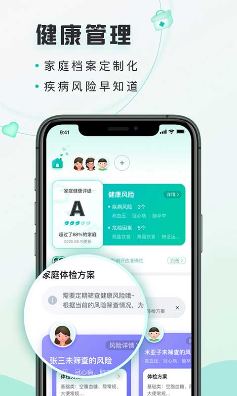 【科学体检】覆盖全国2000多家公立医院体检资源,提供个性化体检方案定制服务,体检报告自动同步至APP,专业医生提供免费解读和建议,实现早发现早干预。