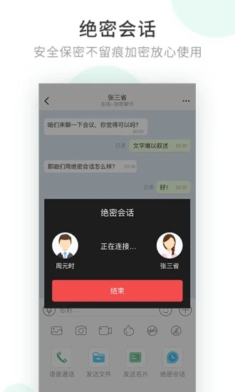 绝密会话聊天不仅可加密,还可以自己设定时间销毁,会话结束所有聊天窗口消失,清除,雁过无痕。不显示用户昵称,头像等任何信息!系统会生成随机会话ID,确保匿名性。