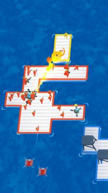 1、开局选择代表阵营的特色颜色,通过收集海上漂流物资不断升级木筏。从简陋的舢板逐步改造成坚不可摧的战舰。