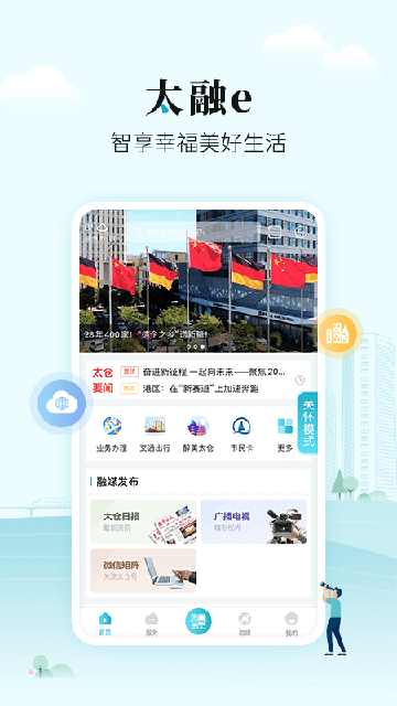 App还提供"轻微事故在线处理"功能,支持交通事故快速定责和保险理赔;"实时查询"可查看公交到站、停车位等信息;"公共自行车"实现扫码租车、站点查询。"云端阅读"汇集上万册电子书籍和期刊杂志;短视频平台展示太仓风土人情和城市发展。这些功能共同构建起全方位的城市生活服务体系。