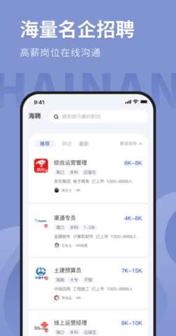 3、是海南人帮助他们发挥优势,找到好工作的专业社交平台。平台定期举办线下招聘会和企业开放日活动,让求职者有机会直接与企业HR面对面交流,深入了解企业文化和岗位要求。
