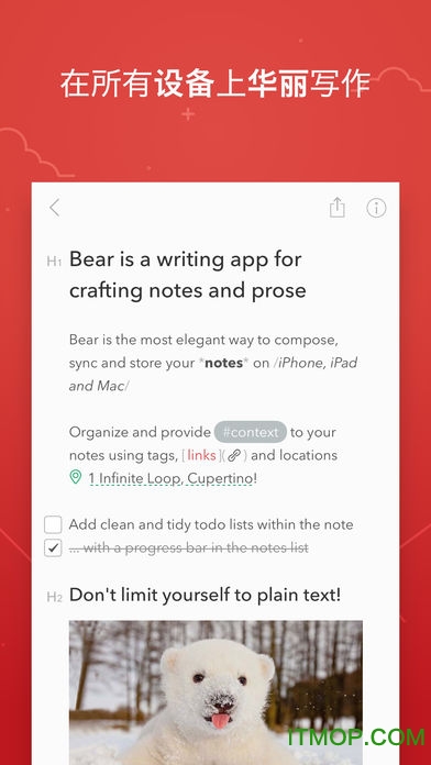 Bear笔记软件是一款专为高效记录与创意写作设计的跨平台应用。它以简洁优雅的界面和强大的功能著称,支持Markdown语法写作,让用户能够轻松创建结构清晰的笔记。无论是日常待办事项、灵感记录还是专业文档撰写,Bear都能完美胜任。通过iCloud实现多设备无缝同步,确保您随时随地都能访问最新内容。独特的标签管理系统让笔记归类更智能,而丰富的导出选项则满足不同场景下的分享需求。特别值得一提的是其专注模式,能有效屏蔽干扰,让写作更高效。目前已有包括作家、程序员、学生等在内的众多用户群体在使用这款优秀的笔记工具。