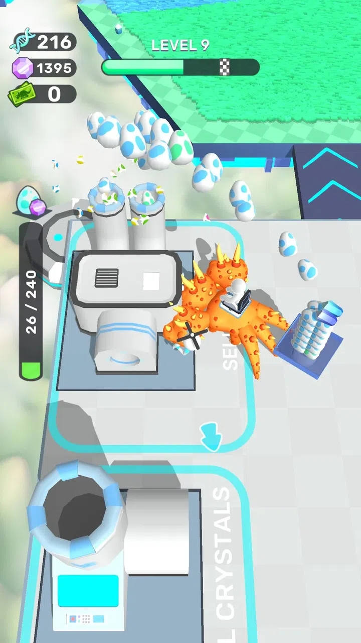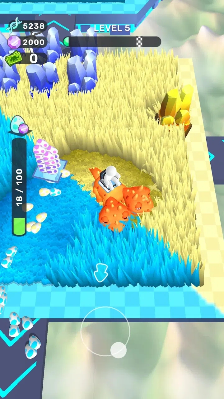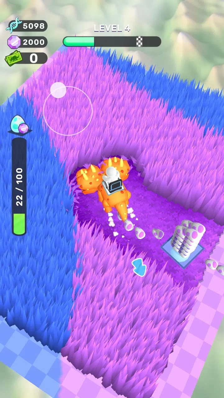 游戏操作简单易上手,玩家只需操控割草机在草地上移动,就能自动收割杂草并收集隐藏其中的恐龙蛋。收集到的蛋蛋可以转化为DNA点数,用于升级恐龙的各项能力。随着游戏进程推进,玩家将解锁新的地图区域,那里蕴藏着更稀有的蛋蛋和宝石资源。游戏还配备了智能机器人助手,它们能自动拾取物品、粉碎障碍物。玩家需要不断升级机器人的工作效率,同时也要注意恐龙的成长状态,通过合理分配资源打造最强恐龙战队。