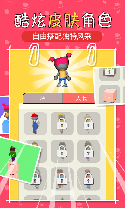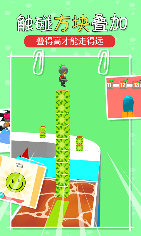 1、在赛道上收集更多的方块,玩有趣的跑酷游戏,积累更多的方块来完成任务。方块不仅是通关的关键,还能解锁特殊道具和装饰物品。收集特定组合的方块还能触发奖励效果。