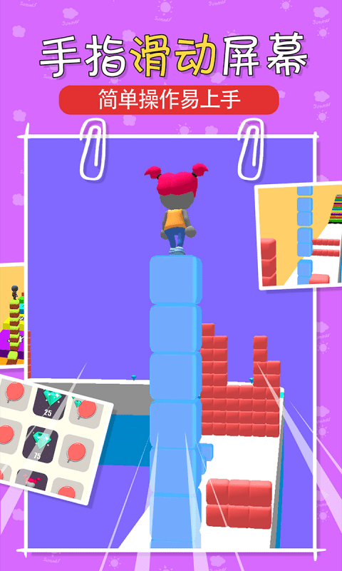 叠块跑酷是一款充满创意与挑战的休闲跑酷游戏,将带给玩家前所未有的指尖冒险体验。在这款游戏中,玩家将操控一个灵活的小人,在色彩缤纷的赛道上奔跑、跳跃,通过收集沿途的方块来增强实力。游戏采用独特的物理引擎设计,让每一次碰撞和跳跃都充满真实感。随着关卡推进,玩家会遇到各种创意十足的障碍物和机关,需要快速反应才能顺利通关。从简单的入门关卡到极具挑战性的高级赛道,游戏提供了丰富的难度梯度,既能满足休闲玩家的需求,也能给硬核玩家带来足够的挑战。清新明快的画面风格搭配动感十足的音效,营造出令人沉浸的游戏氛围。