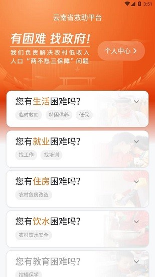 云南省救助平台app是一款专为云南省居民打造的综合性救助服务软件。该平台致力于为遇到生活困难的用户提供全方位的帮助,涵盖生活救助、教育支持、医疗援助等多个领域。通过智能化的服务系统,用户可以便捷地获取各类救助资源,平台操作界面简洁明了,即使是初次使用的用户也能快速上手。无论是个人申请还是代他人求助,都能在这里找到合适的解决方案,真正实现"一键求助,多方响应"的服务理念。