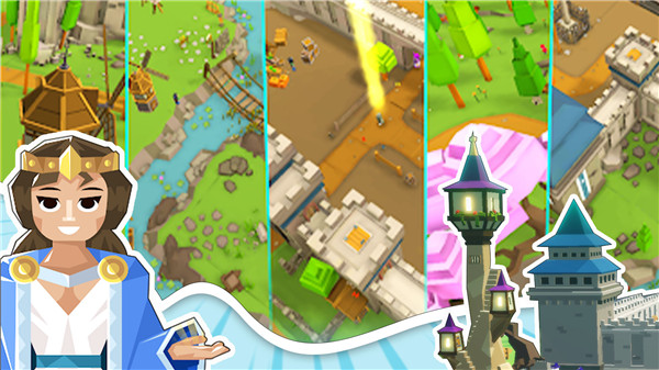1、游戏采用精美的卡通3D画风,每一个建筑单位都经过精心设计,昼夜交替的光影效果让整个王国世界栩栩如生。玩家可以自由调整视角,近距离欣赏自己打造的每一处景观细节。