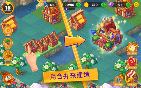 2、合并木头得到小屋,然后合并小屋建造木屋。这种玩法简单有趣,适合所有玩家,让你在游戏中体验到创造的乐趣。