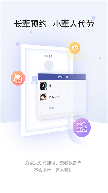 *不会操作,家人帮忙:创新的家庭账号管理系统允许绑定多位家庭成员,子女可为父母远程预约挂号、查询报告。特别设计的简易操作界面,配合大字体显示,让老年患者也能轻松使用各项功能。