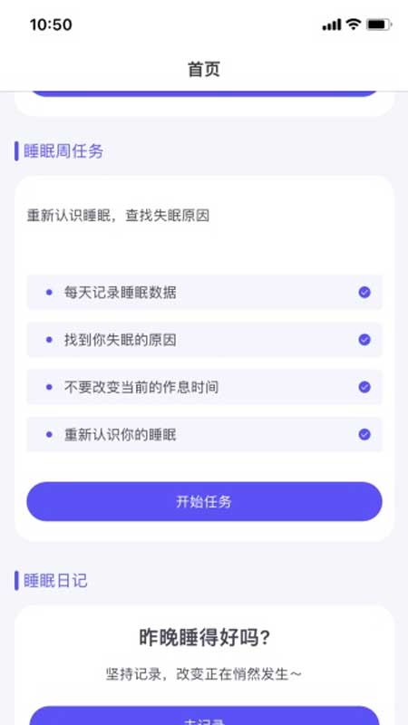 【睡眠周任务】将专业的CBT-I疗法拆解为每日可执行的小任务,通过游戏化设计激励用户坚持完成,系统会智能调整任务难度以适应不同用户进度。