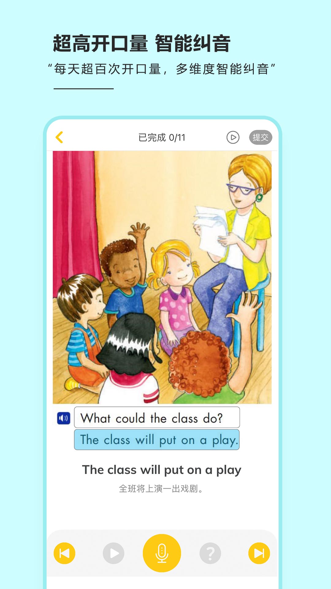 2.智能纠音:逐字逐句进行发音和语速两个维度的打分纠正,让孩子的有实时的反馈。通过先进的语音识别技术,系统能准确指出发音问题,帮助孩子练就标准地道的英语发音。