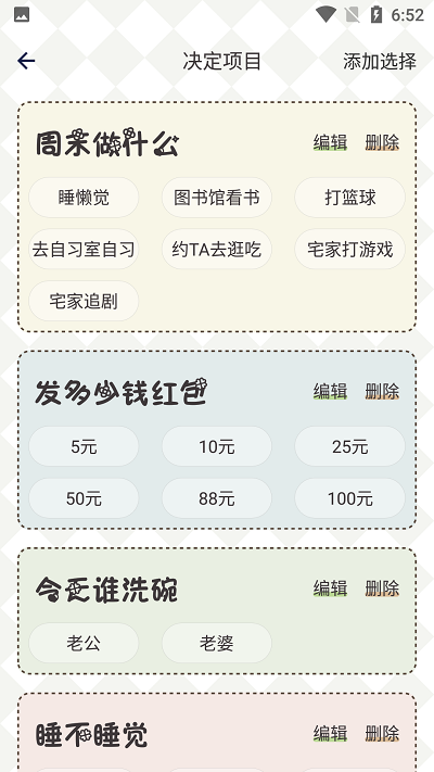 特别适合用于解决那些看似简单却让人纠结的日常选择。软件支持创建分类决策集,比如"午餐选择"、"电影推荐"、"周末活动"等,让生活更有条理。
