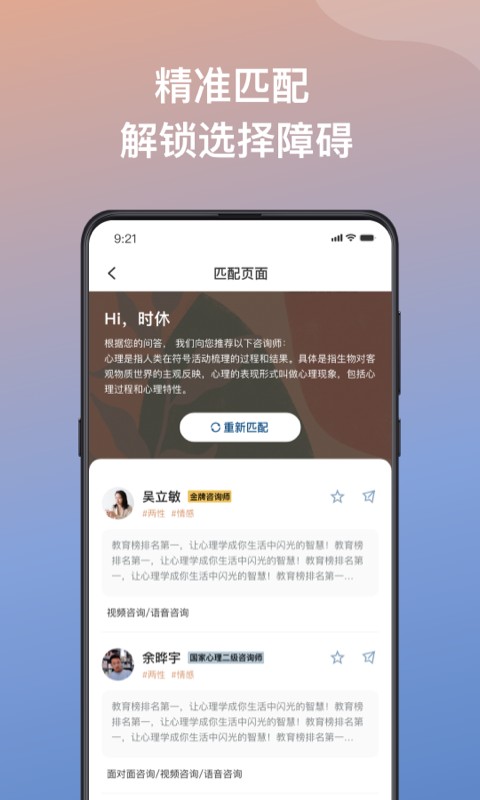 其中推荐课程;我们只是汲取经验丰富的咨询师;平台提供智能匹配系统,可根据用户的具体情况推荐最适合的咨询师。2、能够解决实际的心理问题,是我们最大的心愿;平台支持多种咨询方式,包括即时文字咨询、语音通话和视频咨询,满足不同用户的需求。3、我们的平台没有广告,没有提供任何课程学习和其;保持纯净的咨询环境是我们的承诺。4、他评测,也不介绍课程,更不会在心理咨询的过程;我们专注于提供专业的心理咨询服务,不涉及任何商业推广。