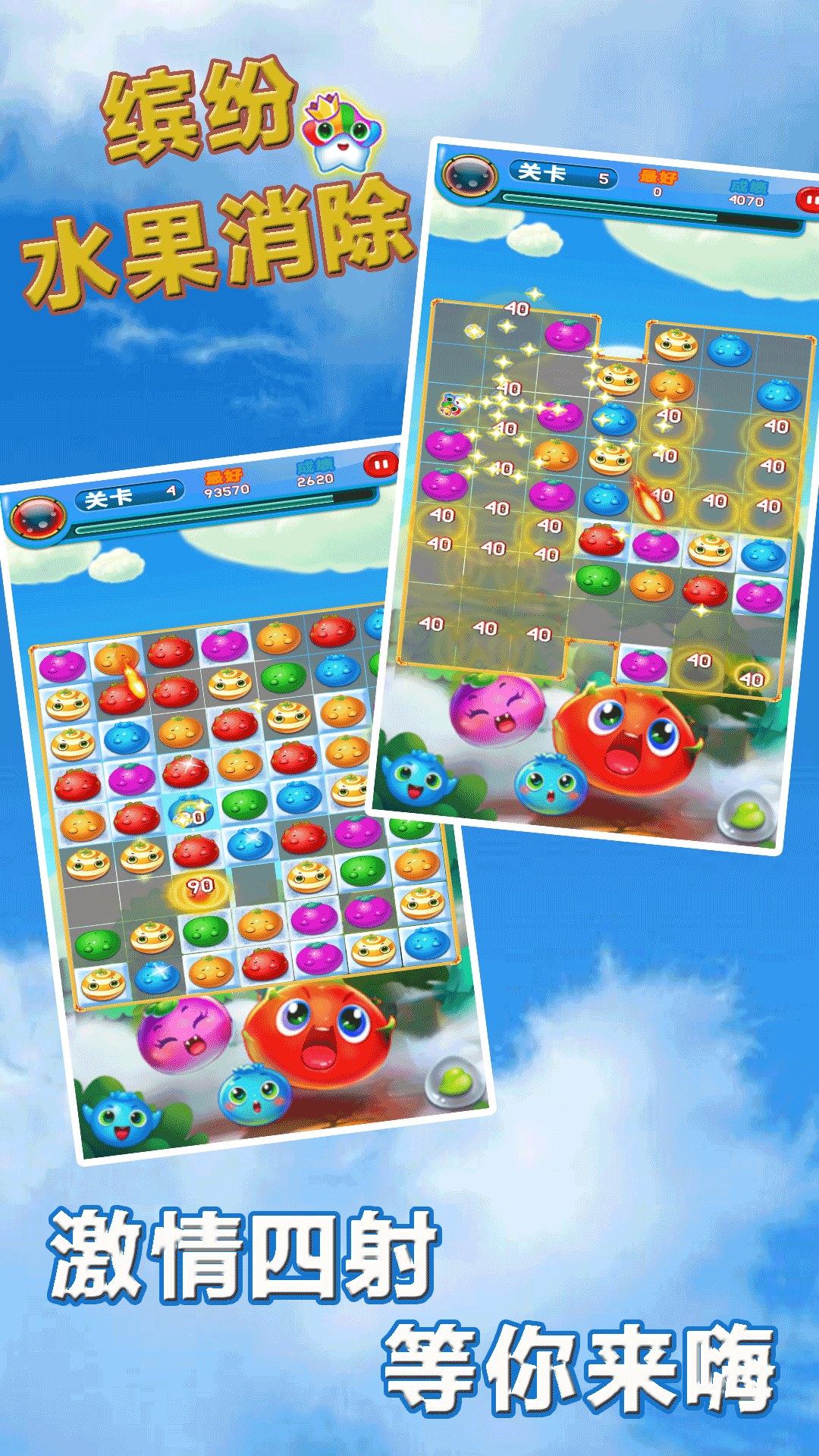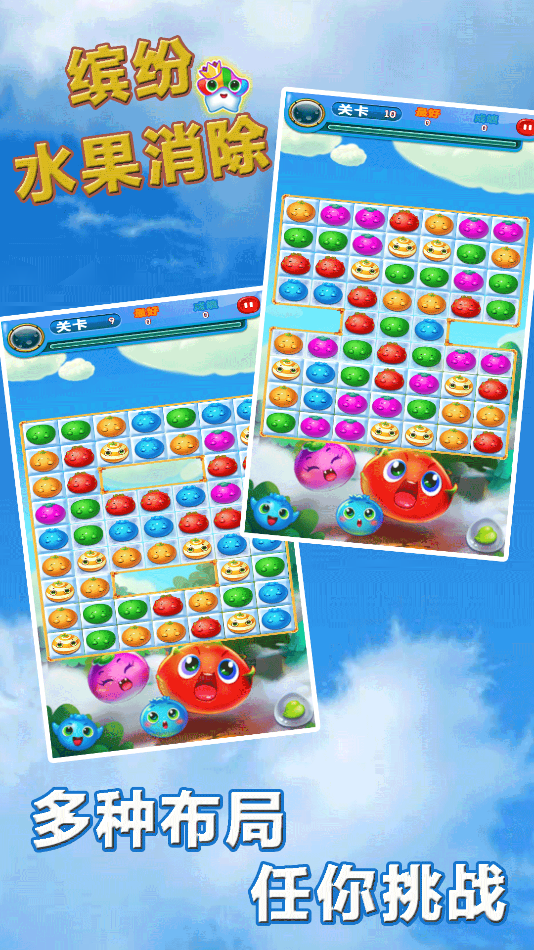 1、玩家在游戏中要将3个以上相同的水果排在一起消除,并藉此各种道具。通过连击和特殊消除可以触发强力道具,帮助玩家更轻松地完成挑战。游戏操作简单直观,只需轻点屏幕即可完成所有操作。