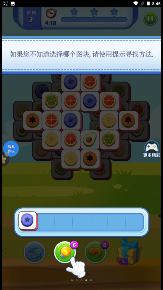 每一关均会赠送玩家三次提示机会。当您遇到棘手的情况时,系统会高亮显示一组可消除的方块组合,帮助您渡过难关。