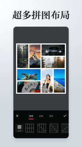 2、提供精确的手动调整功能,每个细节都能完美掌控。海量专业拼贴模板满足不同场景需求,九宫格裁剪功能让照片排版更加整齐美观;
