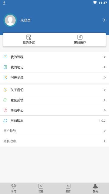 软件提供全面的学习功能模块,包括个人中心管理、课程离线缓存等实用工具。在"我的"模块中,用户可以查看学习进度、管理个人信息;"我的课程"和"我的协议"让用户轻松管理已购课程和相关协议;"听课记录"功能自动保存用户的学习轨迹,方便随时回顾;"我的收藏"和"错题记录"则帮助用户整理重点内容和易错题目,形成个性化的学习资料库,大幅提升学习效率。