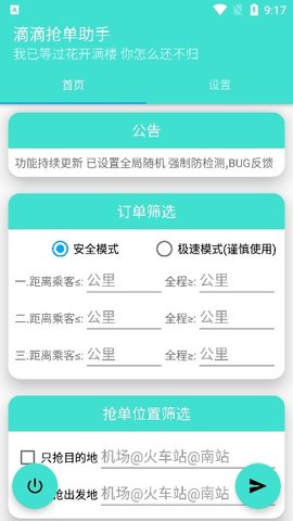 订单筛选可支持安全模式和速度模式,并可设定乘客与全程的距离。