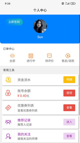 进入个人中心后,您可以在线推查看订单和在线提取现金