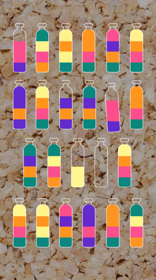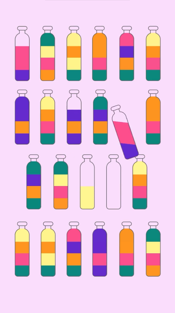 魔幻拼一拼以独特的水瓶造型和液体分类为核心玩法,每个透明水瓶都像精致的化学仪器。玩家需要通过点击控制液体流动,将同色液体归入同一瓶子。关键技巧在于观察液体分层情况,优先处理顶部液体,利用空瓶作为中转站。游戏设计了物理模拟效果,倾倒时会有真实的液体晃动动画,增加了操作沉浸感。特别注意液体只能部分转移的特性,这要求玩家必须精确计算每次倾倒量。随着关卡解锁,还会出现彩虹色、渐变色等特殊液体,让分类过程更具视觉冲击力和挑战性。