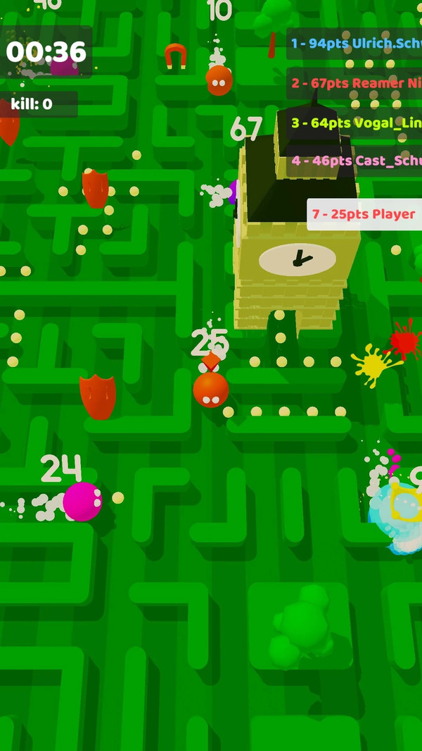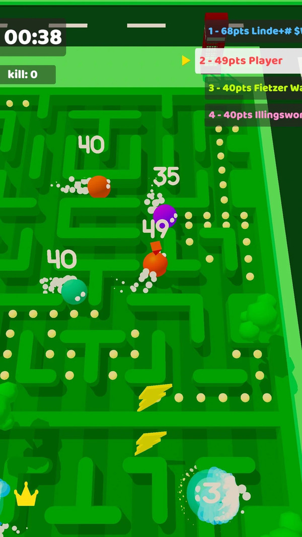 3、游戏界面清晰显示每个角色的当前积分,这是制定战术的重要依据。遇到高分玩家要灵活走位躲避,同时寻找机会反超。游戏还设有多种增益道具,合理使用可以扭转战局。