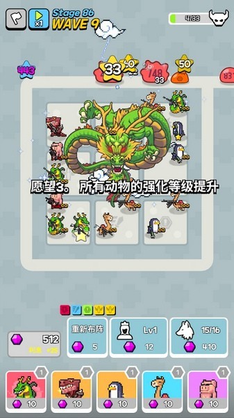 1.游戏采用动态难度系统,每次关卡都会随机生成不同类型的敌人组合,玩家需要根据实时战况灵活调整防御策略。除了常规模式外,还设有极限生存、无尽挑战等多种特殊玩法,让玩家体验不同维度的策略乐趣。2.游戏拥有丰富的动物收集系统,包含数十种各具特色的动物角色,每个角色都可通过升级解锁新技能和属性加成。独特的像素美术风格搭配生动的角色动作,为玩家营造出轻松有趣的游戏氛围。不同属性的动物之间还能产生特殊羁绊效果,为阵容搭配带来更多可能性。