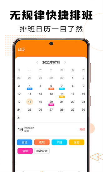 班别颜色设置,根据醒目的颜色分类,快速掌握每日的排班信息。颜色方案可完全自定义,满足不同用户的视觉偏好。