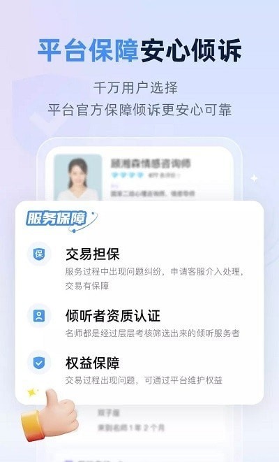 1.平台实施三层认证体系筛选咨询师,需具备国家二级心理咨询师资质及500小时以上临床经验,通过伦理考核后还需完成平台专属的危机干预培训。定期复审机制确保老师持续更新专业知识,用户可查看每位咨询师的受训背景和用户评价,实现透明化选择。