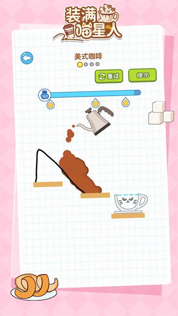 《装满喵星人》是一款充满萌趣的休闲经营游戏,玩家将化身咖啡店老板,通过创意画线的方式为可爱的喵星人制作美味咖啡。游戏采用简约清新的画风,操作简单却充满挑战性。你需要发挥想象力,用各种划线方法将咖啡原料精准倒入杯中,完成订单任务。随着关卡推进,还能解锁更多咖啡配方和装饰元素,打造属于自己的特色猫咖。无论是打发碎片时间还是享受创意乐趣,这款游戏都能带来轻松愉快的体验。