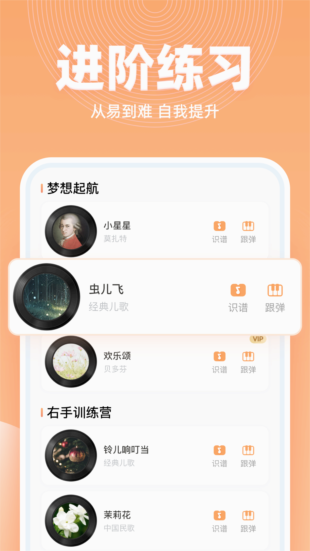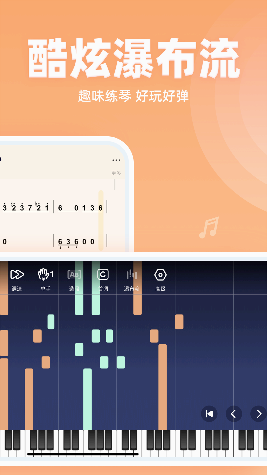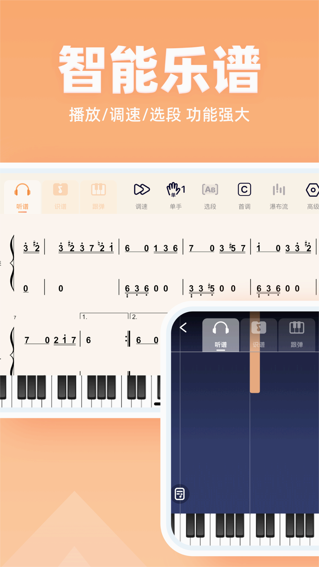 【智能曲谱】:虫虫钢琴简谱内置AI钢琴简谱系统,提供多种智能辅助功能。用户可以进行分手练习、速度调节、曲调变化等操作,系统还会根据用户的练习情况给出个性化建议。智能节拍器和音准检测功能帮助用户提升演奏精准度,让练琴事半功倍。