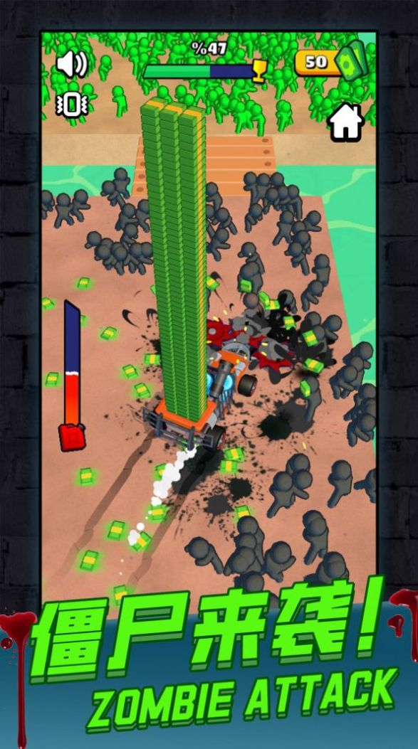 你可以像割草一样割僵尸,面对巨大的僵尸,你可以升级自己的齿轮车进行冒险。
