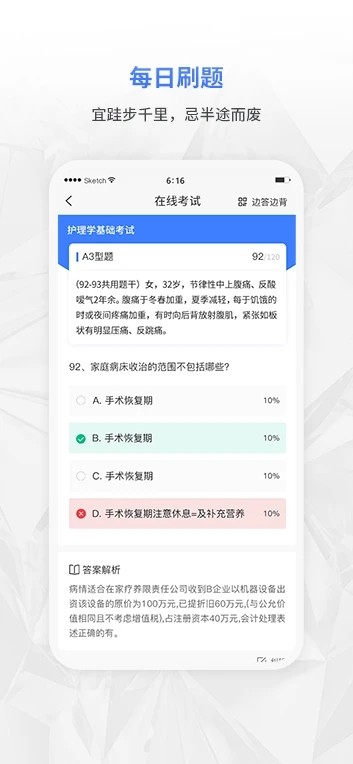 资源丰富多样,平台整合了视频课程、音频讲解、电子教材、海量题库及密题等优质医学资源,满足不同学习偏好。题库内容全面,覆盖护士资格证、临床执业(助理)医师、卫生职称等主流医学考试,确保备考无死角。题型设计科学,包含单选、多选、案例分析等各类医考题型,适应不同复习阶段的需求。试题精选精编,紧扣考试大纲要点,每道题目都配有详细解析,既能帮助用户快速掌握考点,又能巩固基础知识。系统化的章节训练,让用户循序渐进地掌握全部考试内容。