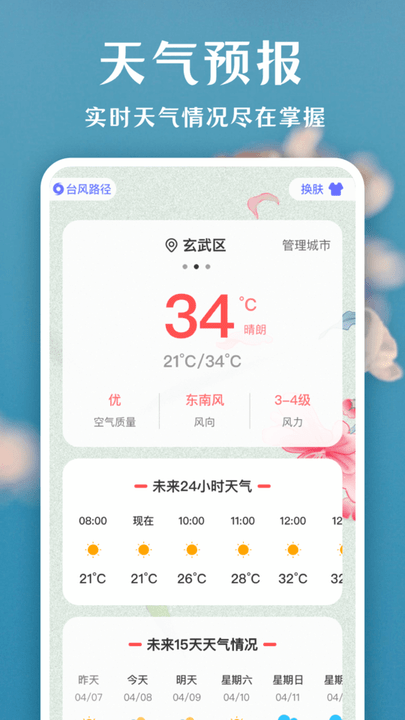 2、软件提供全面的天气信息服务,包括15日天气预报、实时空气质量监测、紫外线指数、穿衣建议等生活指数,帮助用户合理安排户外活动。所有天气数据均来自权威气象机构。