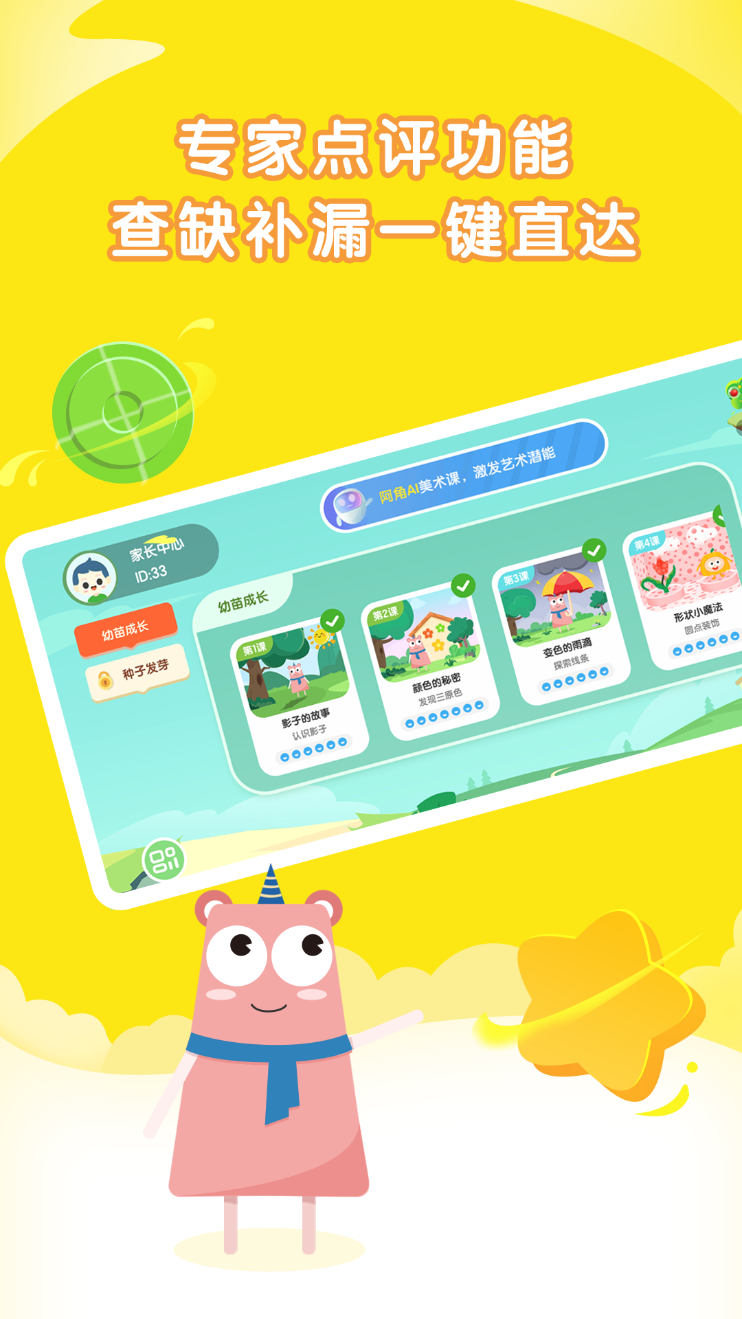 阿角美术App是一款专为3-8岁儿童设计的智能美术启蒙平台,通过创新科技与专业教育理念的完美结合,打造沉浸式学习体验。该应用采用"真人+动画"互动教学模式,配备专家点评功能可一键查缺补漏,AI智能互动系统培养孩子自主学习能力。独创的智慧成长树系统记录学习轨迹,个性化学习报告让进步可视化,配合科学分阶的课程体系,让孩子在趣味探索中系统掌握美术五大核心素养,是陪伴孩子艺术成长的智能伙伴。