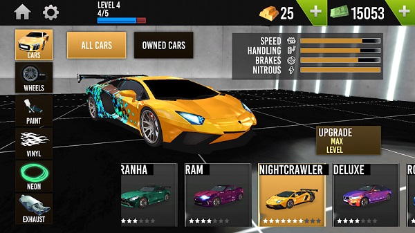 5、点击GARAGE可升级车辆和购买新车辆,每辆赛车都有独立的性能树,升级引擎、变速箱等部件可解锁隐藏属性