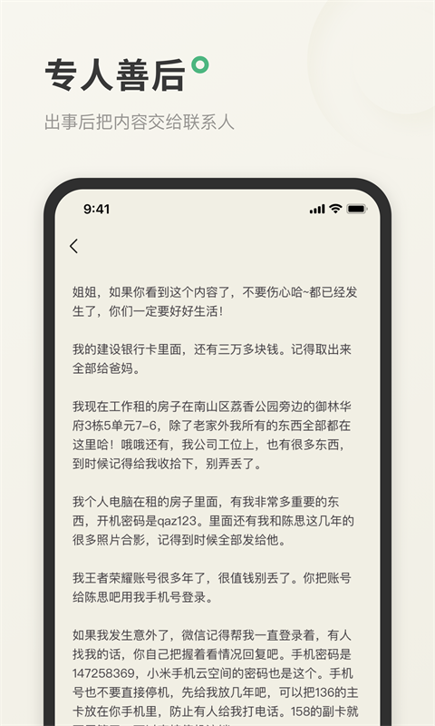 2、该服务可以说是情感遗嘱,可以给亲人,朋友们传递留言和叮嘱,不做法律上的遗嘱。不同于传统遗嘱的严肃性,情感遗嘱更注重精神传承。用户可以创建多个收件人组别,针对不同关系定制专属留言,甚至设置生日、纪念日等特殊日期的自动送达。