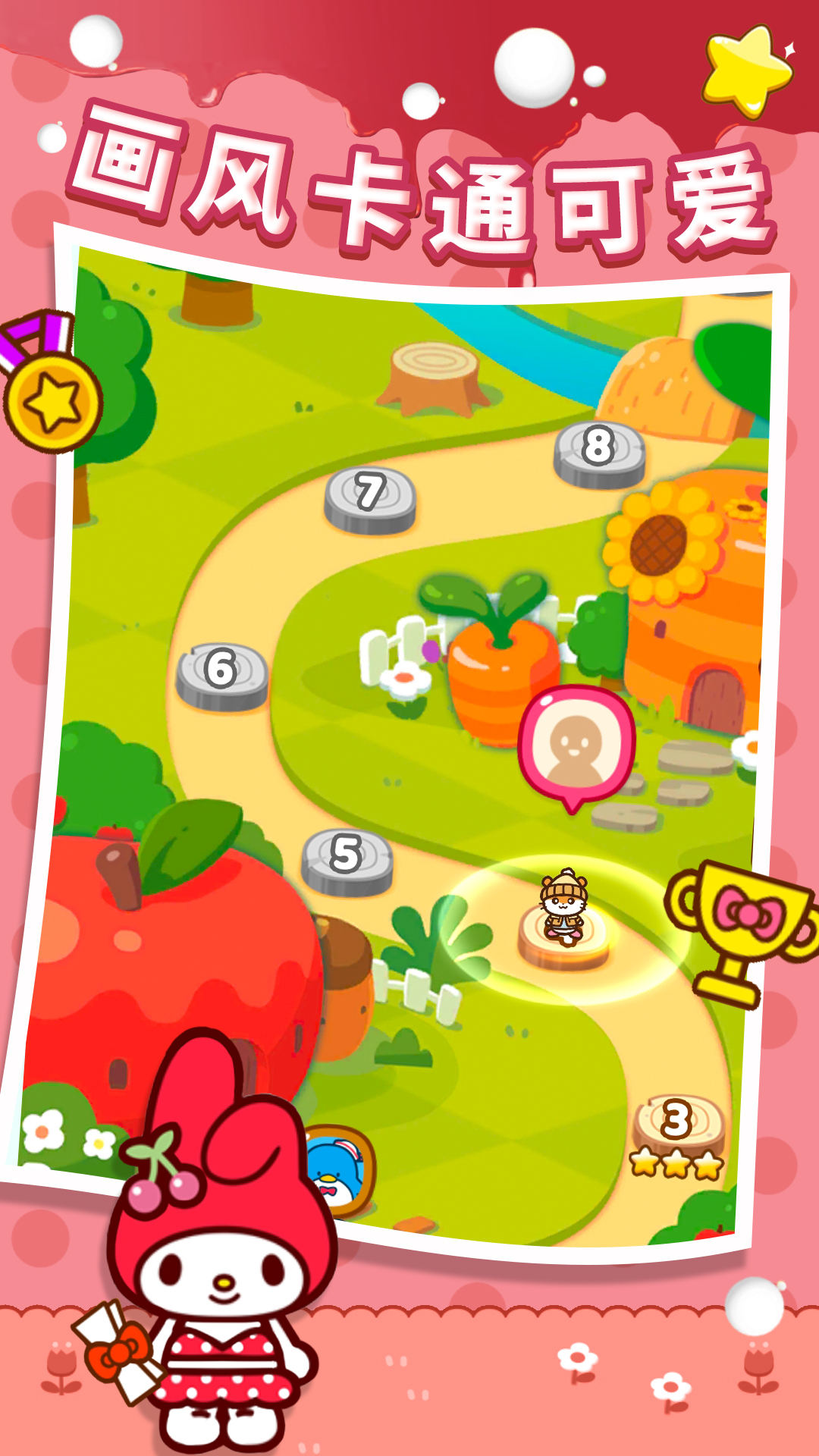 《极速凯蒂猫》是一款以经典三丽鸥IP角色凯蒂猫为主题的正版消除游戏。玩家将与Hello Kitty、美乐蒂等熟悉的三丽鸥明星一起展开趣味十足的消除冒险。游戏采用独特的星星消除玩法,通过滑动屏幕连接相同颜色的星星来完成消除。每个角色都拥有专属道具技能,在关键时刻能助你一臂之力。精美的画面搭配轻快的音效,带来轻松愉悦的游戏体验。无论是休闲娱乐还是挑战自我,这款游戏都能满足不同玩家的需求。
