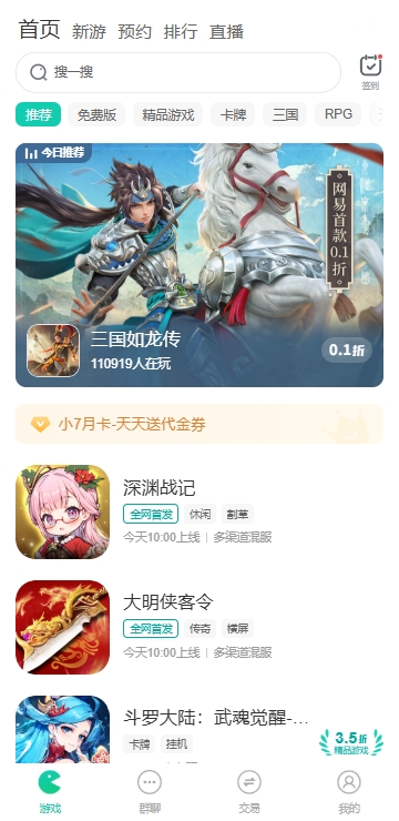 小七手游折扣平台app是一款专为安卓用户设计的超值游戏福利平台。在这里,玩家可以免费下载海量热门手游,享受最低0.1折的惊人折扣,几乎不用花钱就能体验氪金大佬的快感。平台不仅提供超低折扣充值服务,还有丰富的游戏礼包、代金券等超值福利。所有充值操作简单快捷,返利即时到账,让您轻松畅玩各类手游。无论是想体验新游戏,还是想在现有游戏中快速提升战力,小七手游都能满足您的需求,是手游爱好者不可错过的省钱利器。