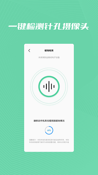 【一键检测】只需轻点屏幕,即可启动全方位扫描,系统会自动分析当前环境中的所有电子设备,精准识别潜在的偷拍装置。先进的检测算法能够穿透常见伪装,发现隐藏在插座、烟雾报警器等物品中的摄像头,让偷拍者无所遁形。