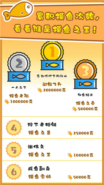 2、模拟排行争当摸鱼大师为小鱼增加了生长机制,摸鱼人摸鱼魂,终有一天靠摸鱼养鱼成为人上人!畅享无限哦。游戏内置全球排行榜,玩家可以比拼摸鱼时长和技巧分数,与好友一较高下,看谁才是真正的职场摸鱼王者。