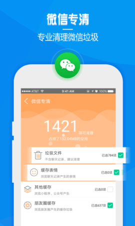 2、【应用专场清理】一键清理QQ、微信、淘宝等软件产生的缓存垃圾及无用信息;