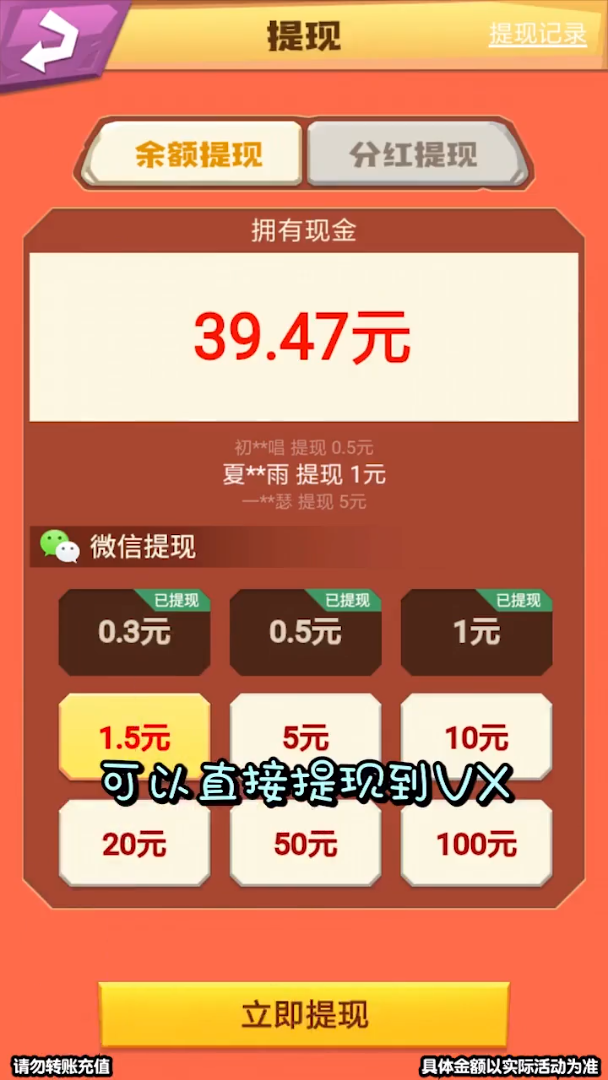 游戏采用真实收益模式,所有奖励都可随时提现,到账速度快且稳定。一键登录系统省去了繁琐的注册流程,新用户还能获得免费大礼包。与传统游戏不同,这款游戏让你在娱乐的同时还能赚取零花钱。每逢节假日都会推出特别福利活动,上线即送现金红包,游戏时长与收益直接挂钩,真正实现玩得越多赚得越多。