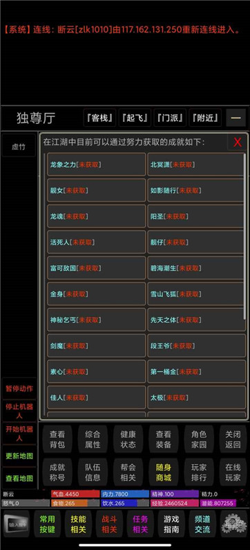 《猛男江湖》完美复刻了经典文字MUD游戏的沉浸式体验,构建出层次分明的武侠世界观。游戏包含二十余个特色门派体系,每个门派都拥有独特的武学传承和宗门任务。玩家可自由选择加入少林、武当等名门正派,或是投身日月神教等邪道宗门,不同选择将解锁截然不同的剧情分支。随着角色成长,你不仅能习得降龙十八掌等传奇武学,还可通过经脉系统突破修为瓶颈,更可参与三年一度的华山论剑,与全服高手争夺武林至尊的殊荣。