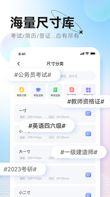 包含1寸、2寸、3寸、4寸等常规尺寸,并配有常用基础色和高端底色。同时提供官方指定证照规格超百种,比如毕业证、学位照、入学照等学生证,会计、考研、计算机、、医护、考研、幼师及语言类考试证,社保、签证、普通话、简历、驾照等,满足您的各类拍摄场景需求。AI大数据分析下,软件还能智能推出当下热门的证件照尺寸供你选择,更快捷高效的用手机制作证件照。系统会定期更新各地最新证件照规范要求,确保您拍摄的证件照100%符合标准。