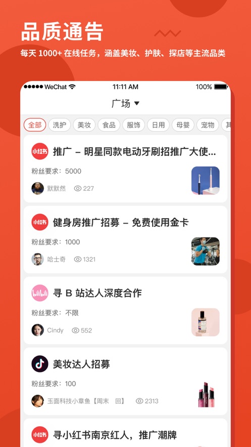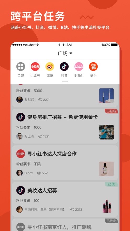 【跨平台海量商机】平台汇聚20万+活跃博主和1万+优质商家,涵盖全品类商品推广需求。用户活跃度高,奖励机制完善,支持抖音、快手、小红书等主流社交平台博主入驻,为商家提供全方位推广解决方案。