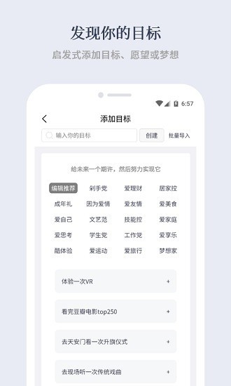 2、智能推荐引擎根据用户画像推送热门目标库,涵盖健康、学习、职场等八大领域。