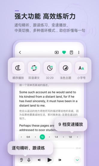 1、逐句精听科学训听力:采用无字幕精听训练法,支持原音反复播放和三级语速调节功能,通过"盲听"模式培养真实语境下的听力理解能力,帮助用户逐步突破听力障碍。
