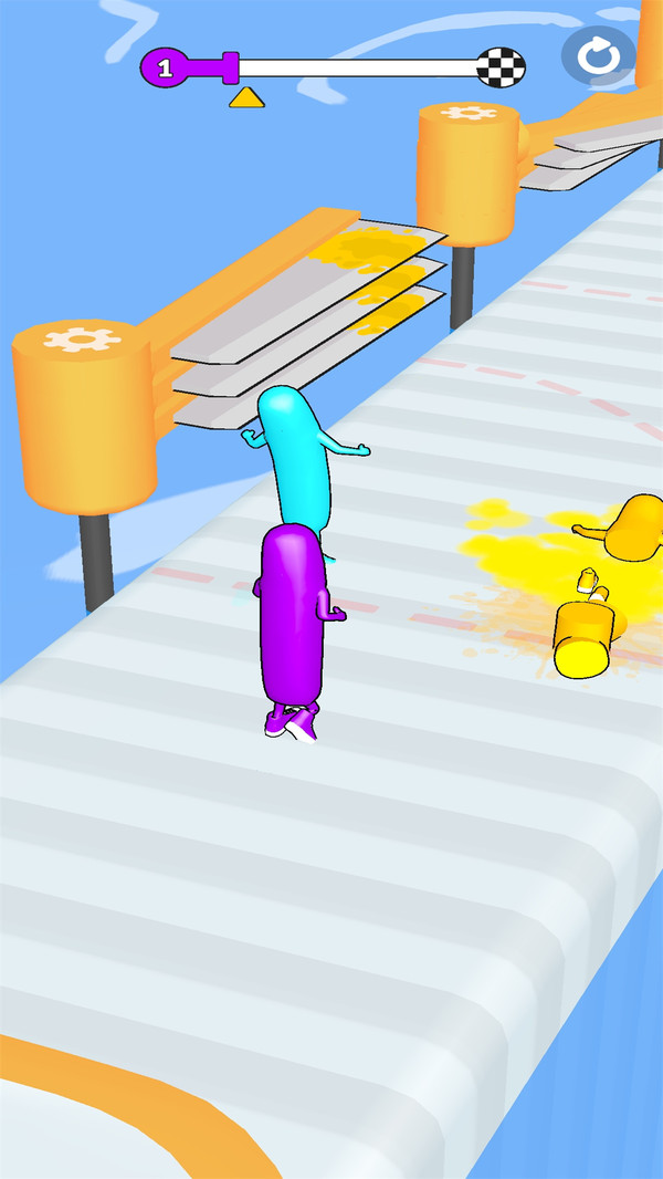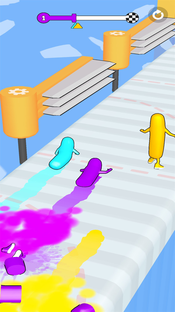 2、你需要和很多的香肠人们一起竞速跑酷,在关卡内相互阻碍、相互攻击。多人模式中可以使用道具干扰对手,比如撒油让对手打滑,或者放置临时障碍物阻挡路线。